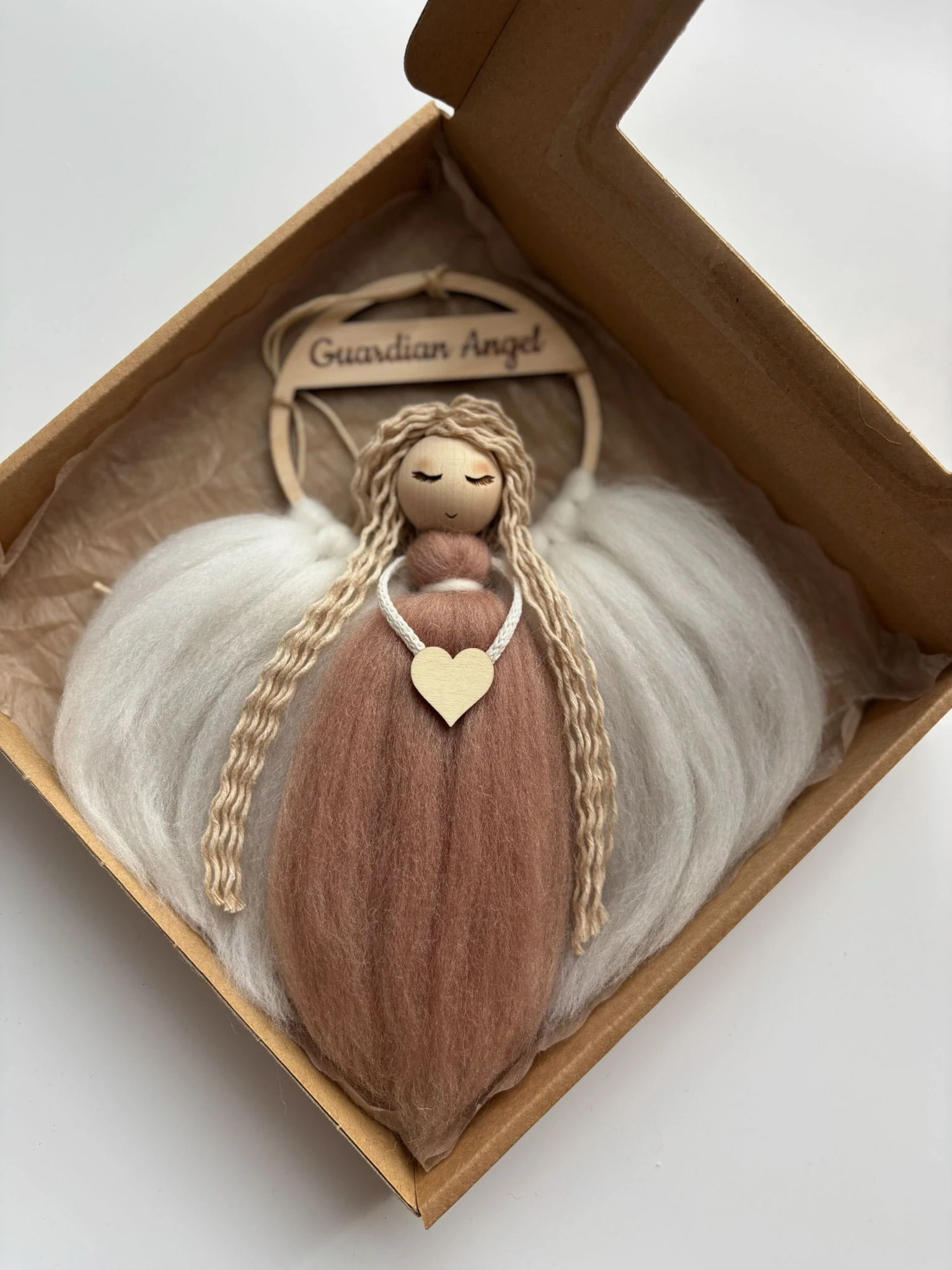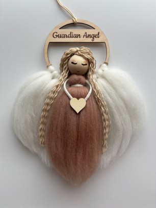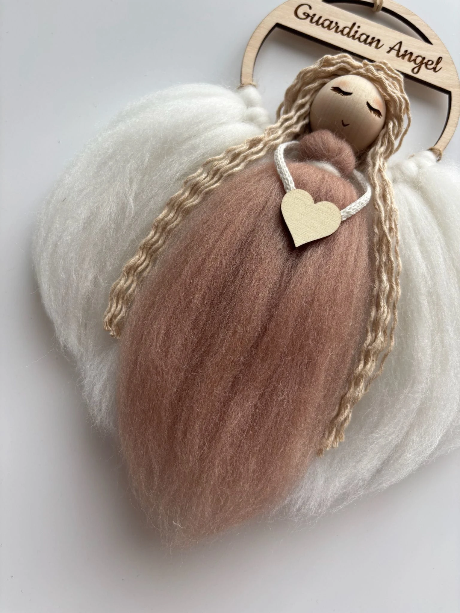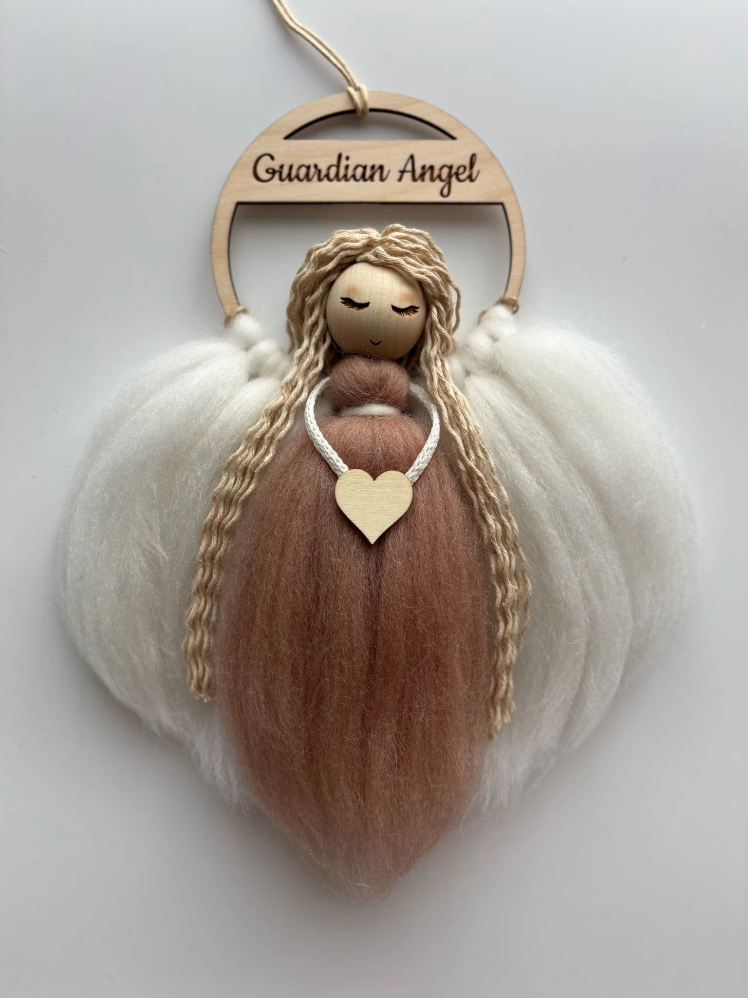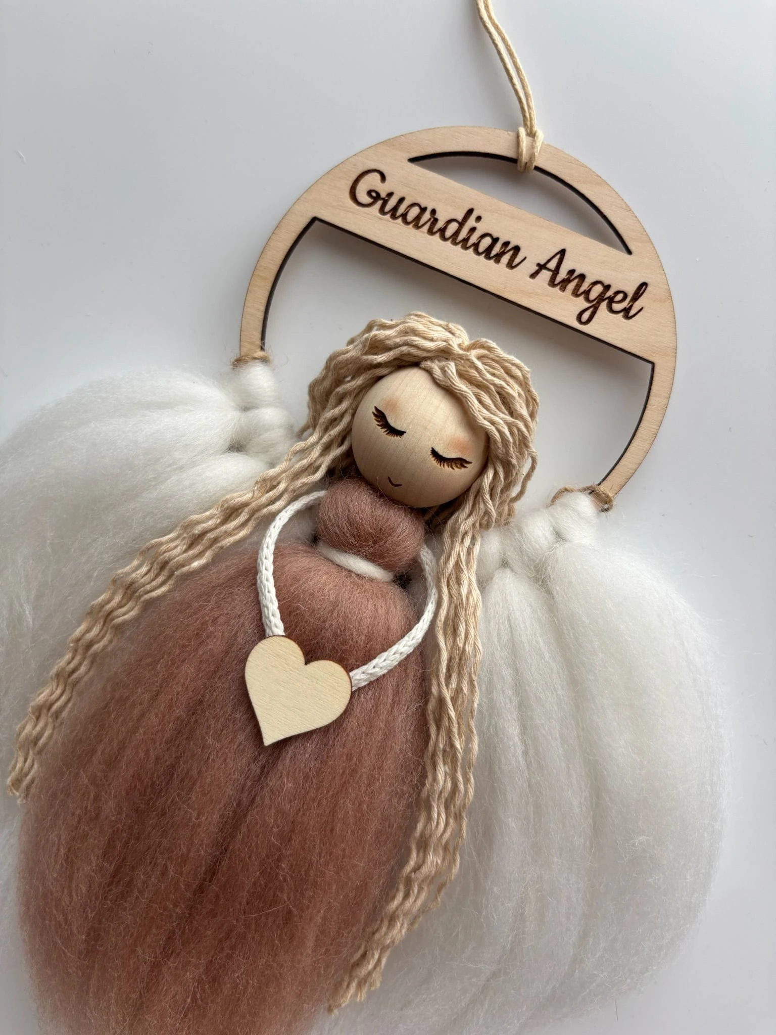 Anioł Stróż handmade – dekoracja ścienna boho z sercem z wełny i drewna – prezent na chrzest, komunię, Boże Narodzenie, do pokoju dziecka