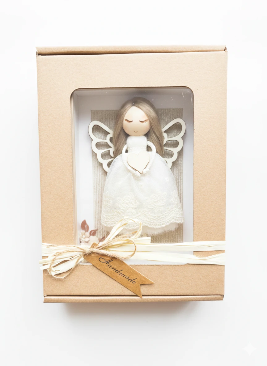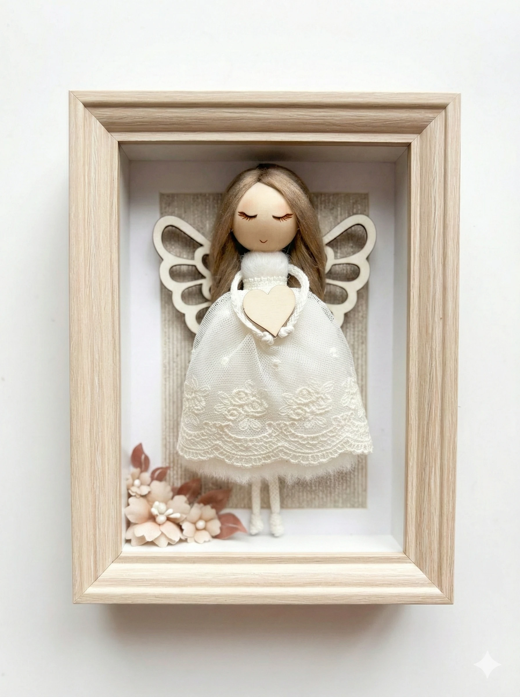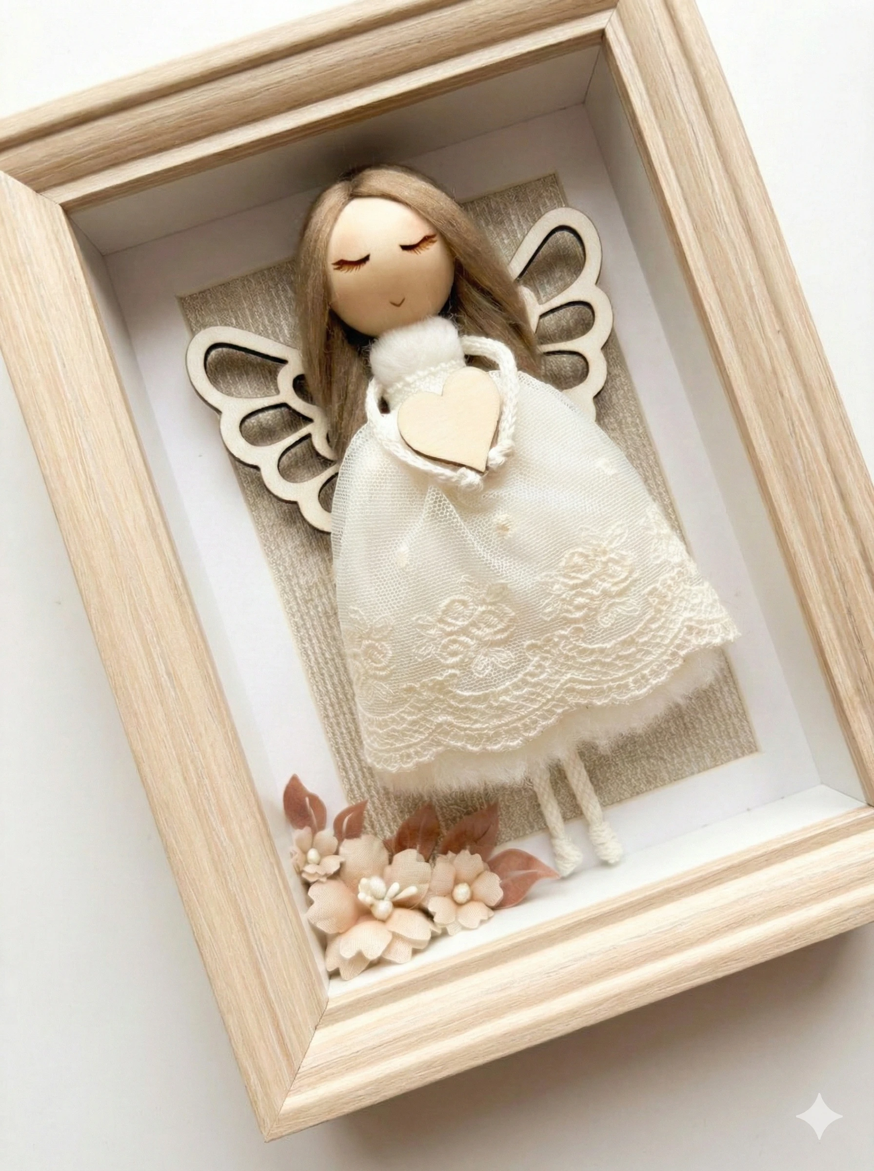 Anioł Stróż w Ramce Drewnianej Handmade – Ręcznie Robiony Prezent Dekoracja Pokojowa, Chrzest, Komunia, Narodziny