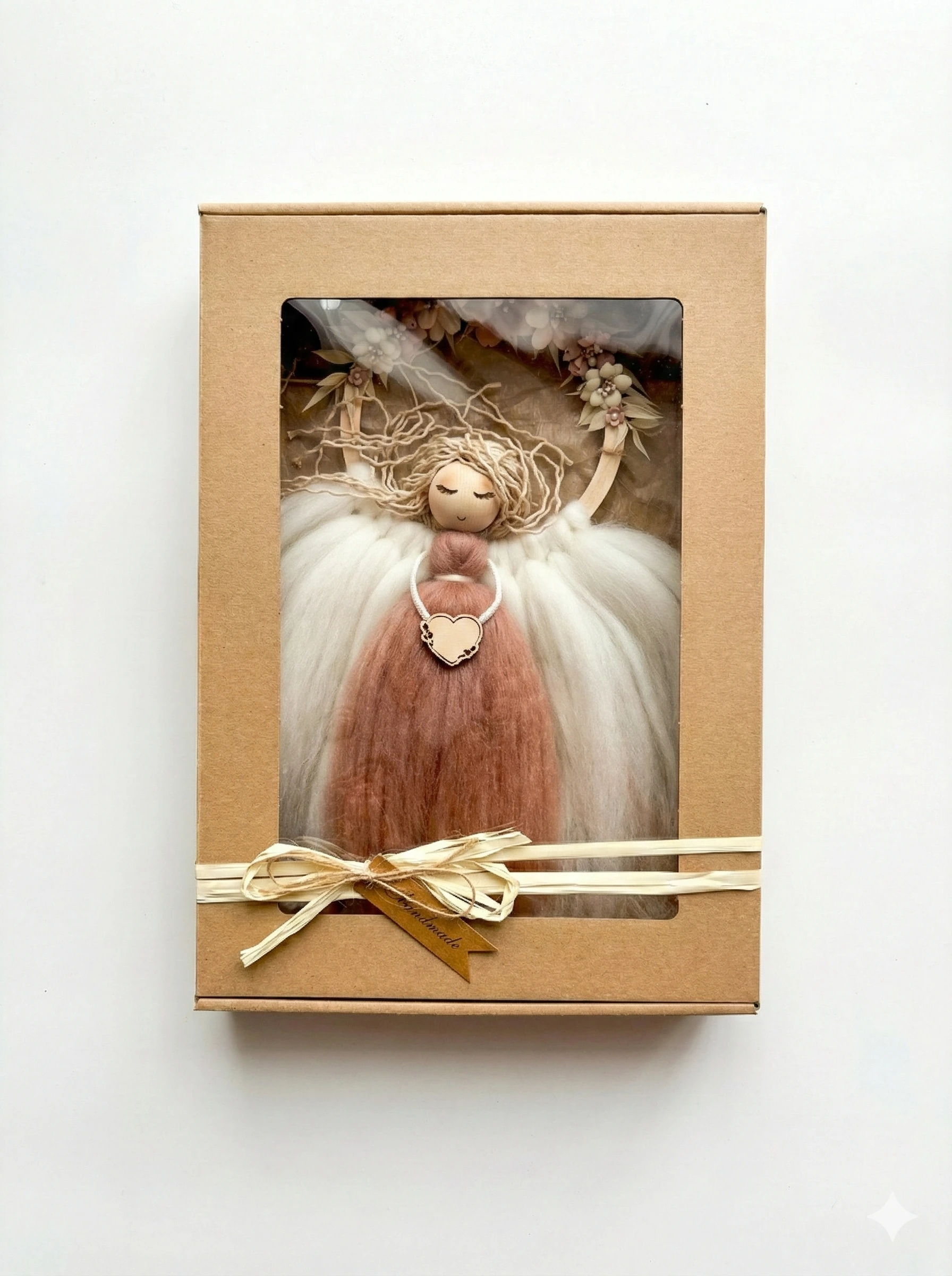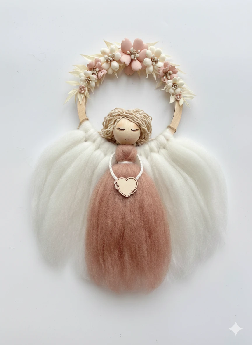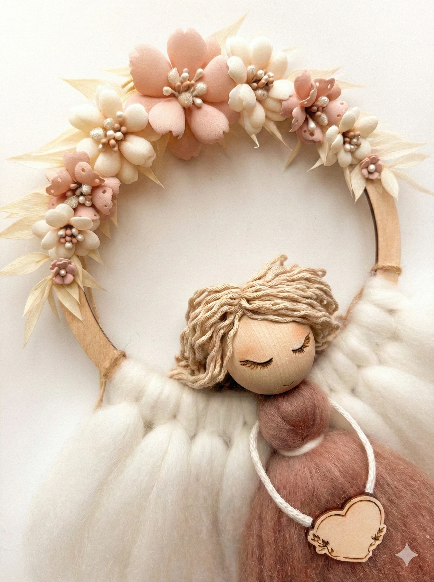 Piękny anioł stróż ręcznie robiony w stylu boho, wykonany z naturalnych materiałów: drewna, włóczki i delikatnych kwiatowych ozdób. Jego miękkie skrzydła i serduszko symbolizują opiekę, miłość i bezpieczeństwo – dlatego jest doskonałym wyborem jako anioł stróż dla bliskiej osoby.