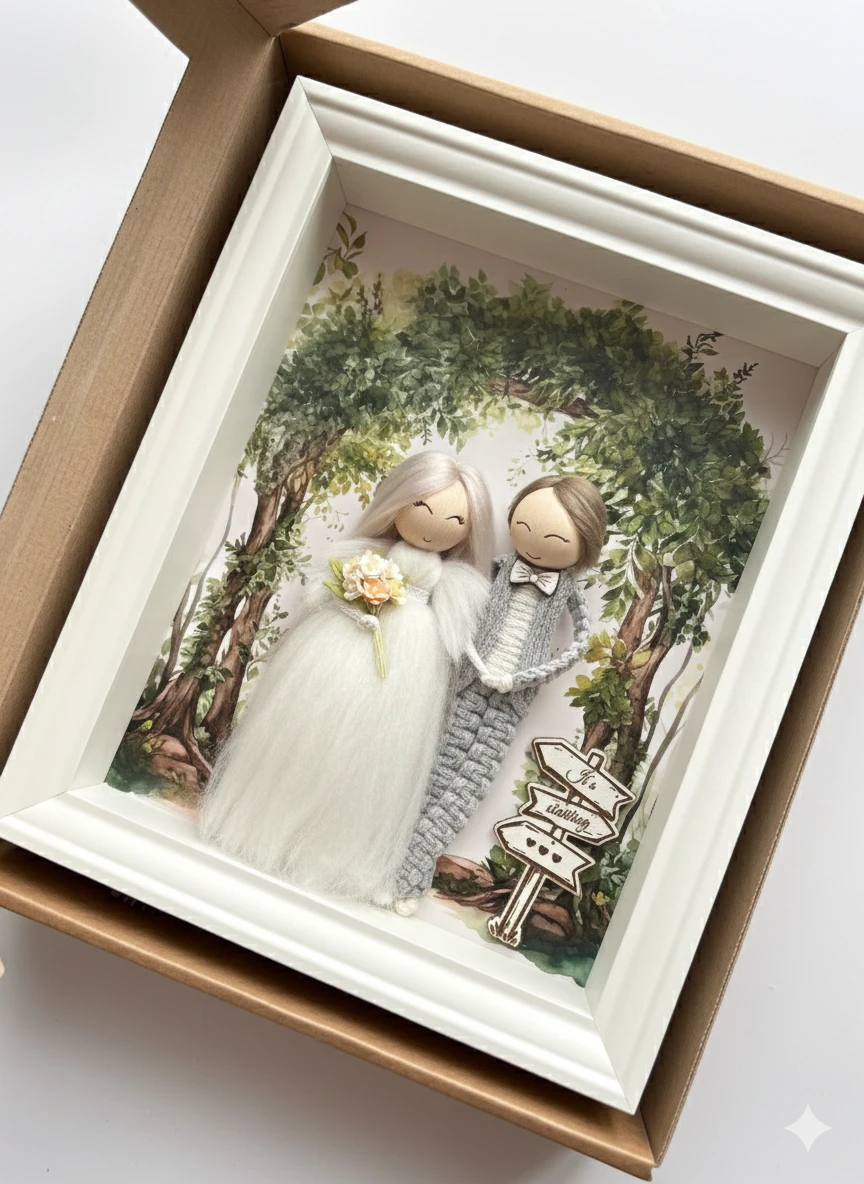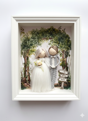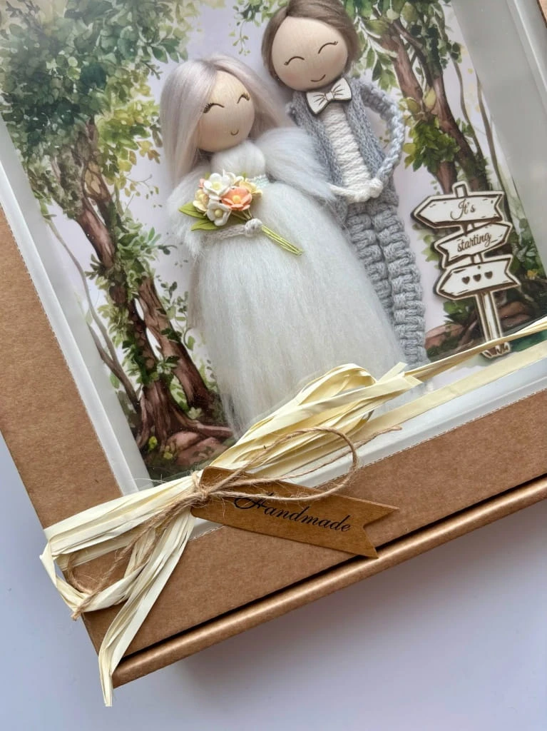 Ręcznie wykonana ramka ślubna handmade z uroczą parą młodą to idealny prezent na ślub, rocznicę lub wesele. Starannie wykonana z naturalnych materiałów, stanowi wyjątkową pamiątkę dla nowożeńców i piękną dekorację ślubną.