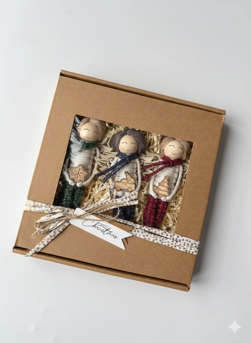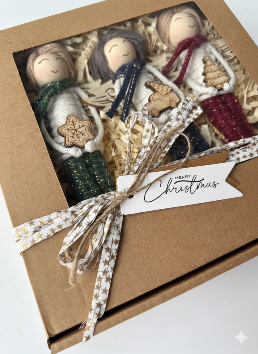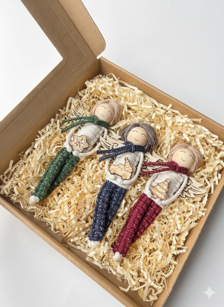 Zestaw 3 Ręcznie Robionych Aniołów Świątecznych w Pudełku Prezentowym – Ekskluzywne Ozdoby Choinkowe Boho, Dekoracja Premium na Gwiazdkę, Prezent dla Bliskich